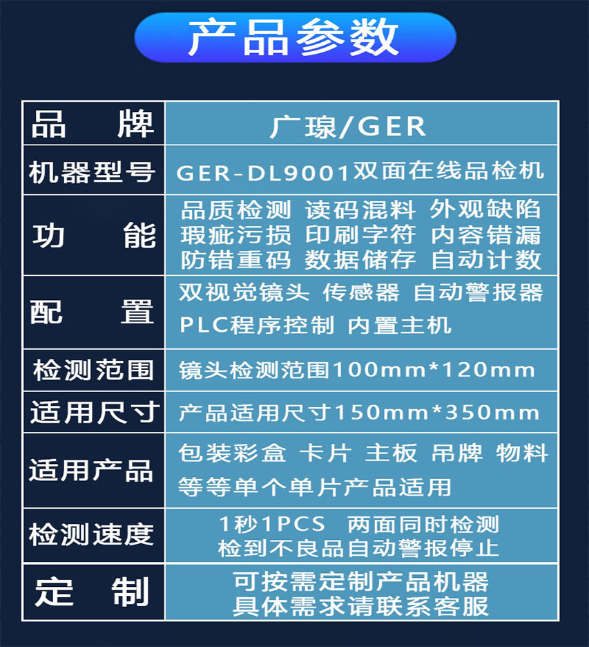 2、檢測功能:燙金燙銀全檢,印刷缺陷、錯誤、偏位、模糊、條形碼/二維碼識別,圖文信息匹配,特征提取,有無(wú)檢測。