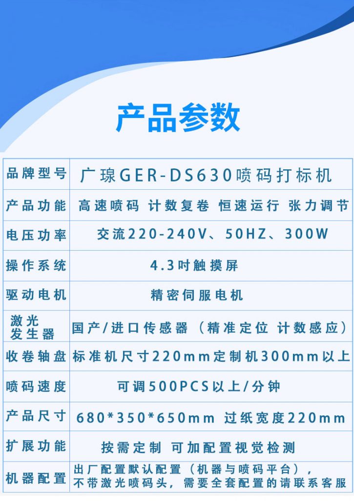 • 激光噴碼機型號:GER-DV630 產(chǎn)品介紹: 全自動(dòng)標簽噴碼機采用新升級雙噴頭,可以對產(chǎn)品進(jìn)行條碼二維碼,生產(chǎn)日期,流水批號 品牌logo圖文的……
